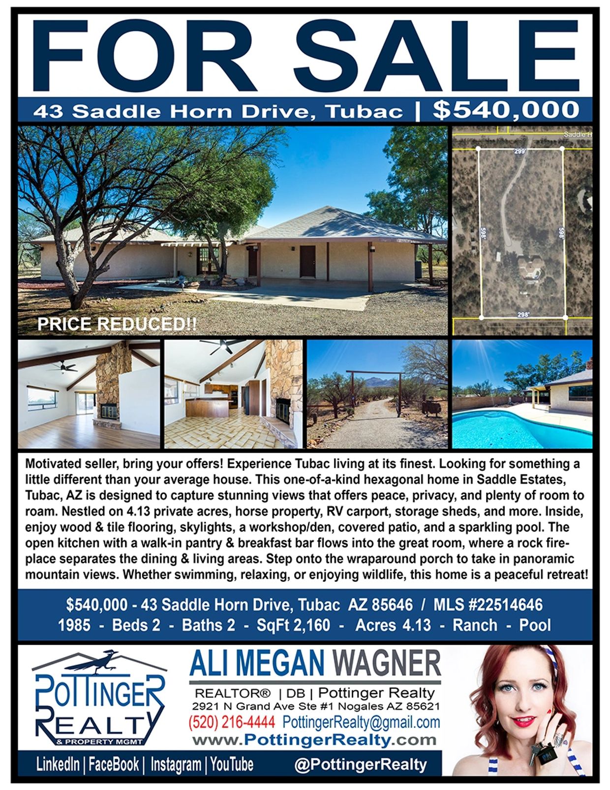 PRICE REDUCED!! Motivated seller, bring your offers! Experience Tubac living at its finest. Looking for something a little different than your average house. This one-of-a-kind hexagonal home in Saddle Estates, Tubac, AZ is designed to capture stunning views that offers peace, privacy, and plenty of room to roam. Nestled on 4.13 private acres, horse property, RV carport, storage sheds, and more. Inside, enjoy wood & tile flooring, skylights, a workshop/den, covered patio, and a sparkling pool. The open kitchen with a walk-in pantry & breakfast bar flows into the great room, where a rock fireplace separates the dining & living areas. Step onto the wraparound porch to take in panoramic mountain views. Whether swimming, relaxing, or enjoying wildlife, this home is a peaceful retreat!